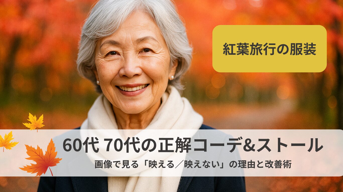 紅葉旅で“映える”秘訣は「色のはっきり感」と「顔まわりの明るさ」。60代70代向けに、写真でわかる配色セオリーと黒・茶アウターの改善術、今すぐ使えるストール色の早見表…